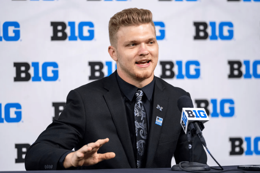 Michigan Senior DE Aiden Huchinson speaks to the media at Big Ten Media days in July of 2021. (AP Photo/Doug McSchooler)